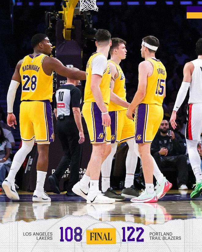 夏普单打得分,格兰特2罚全中,范德比尔特暴扣还以颜色。霍勒迪单打布朗尼得分,开拓者挑战判罚成功,克内克特2罚全中。霍勒迪、夏普与里夫斯各有冲击篮下打进,克内克特中投得分,阿夫迪亚2罚全中,紫金军团请求暂停。里夫斯命中续命远投,波特兰请求暂停。卡马拉空切上篮得分,克林根空接打进,开拓者领先14分得以锁定胜局。比赛仅剩74秒,杨瀚森被替换上场,里斯与克内克特对射远投,时间走完。最终,开拓者以122比108完胜湖人。